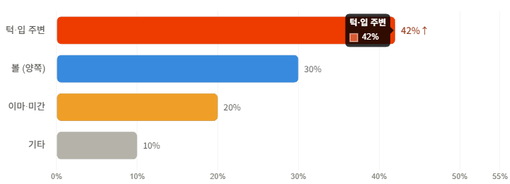 - 성인 여드름 환자의 40% 이상이 턱·입 주변에 트러블을 경험하며, 안드로겐 호르몬 상승이 주요 원인입니다.